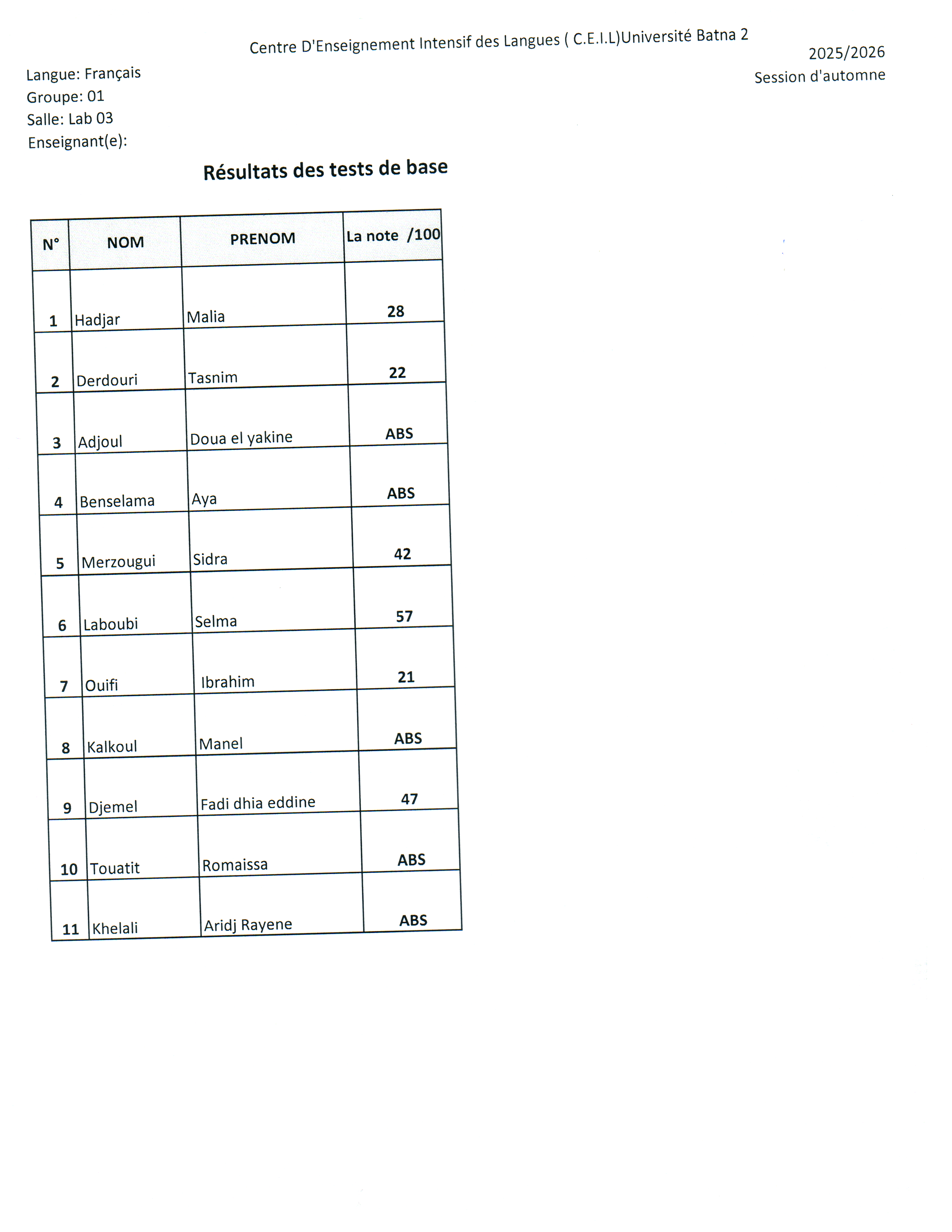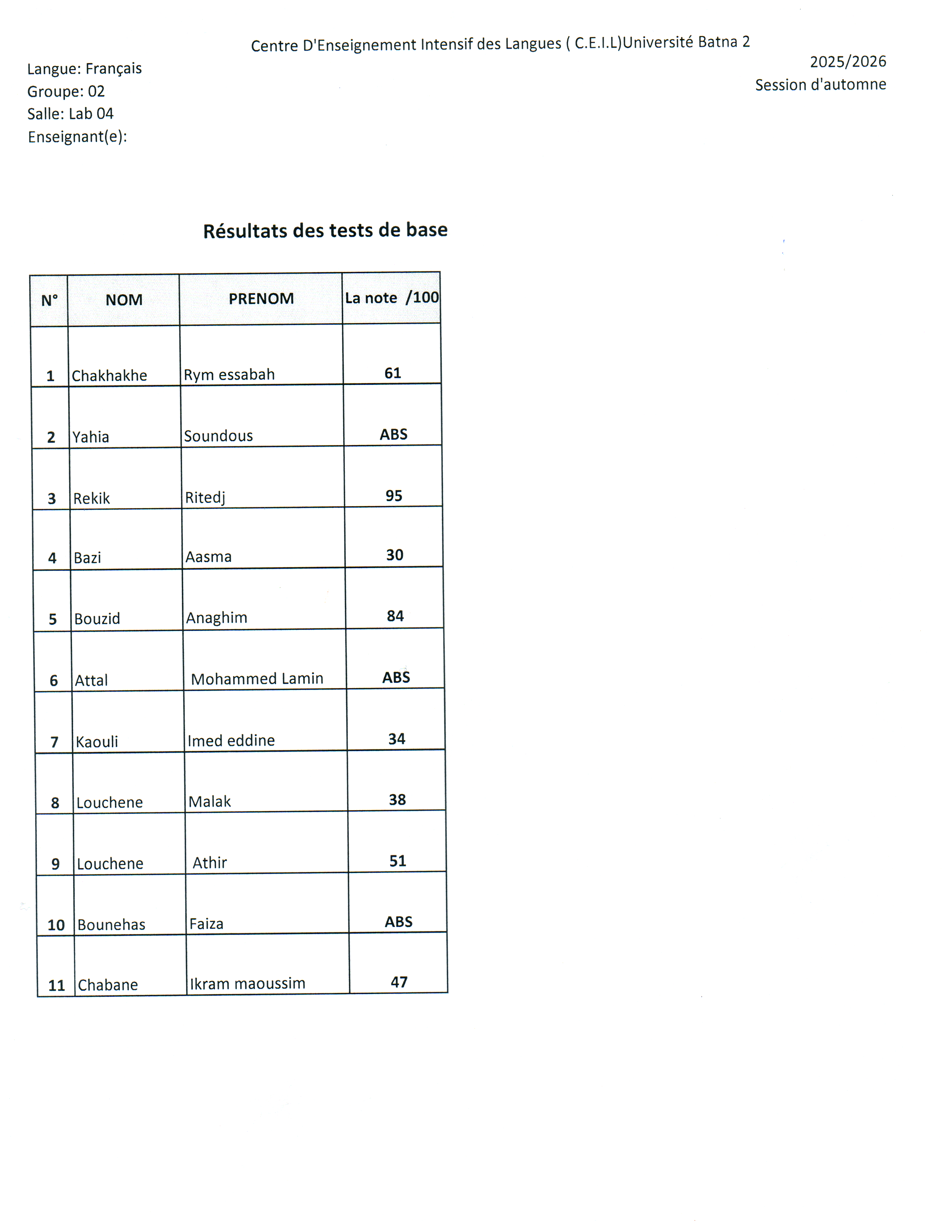 Résultats Test de Base Apprenants Inscrits en français Jeudi Laisser un commentaire / Par ceil ceil / 11 novembre 2025 Spread the love Spread the love